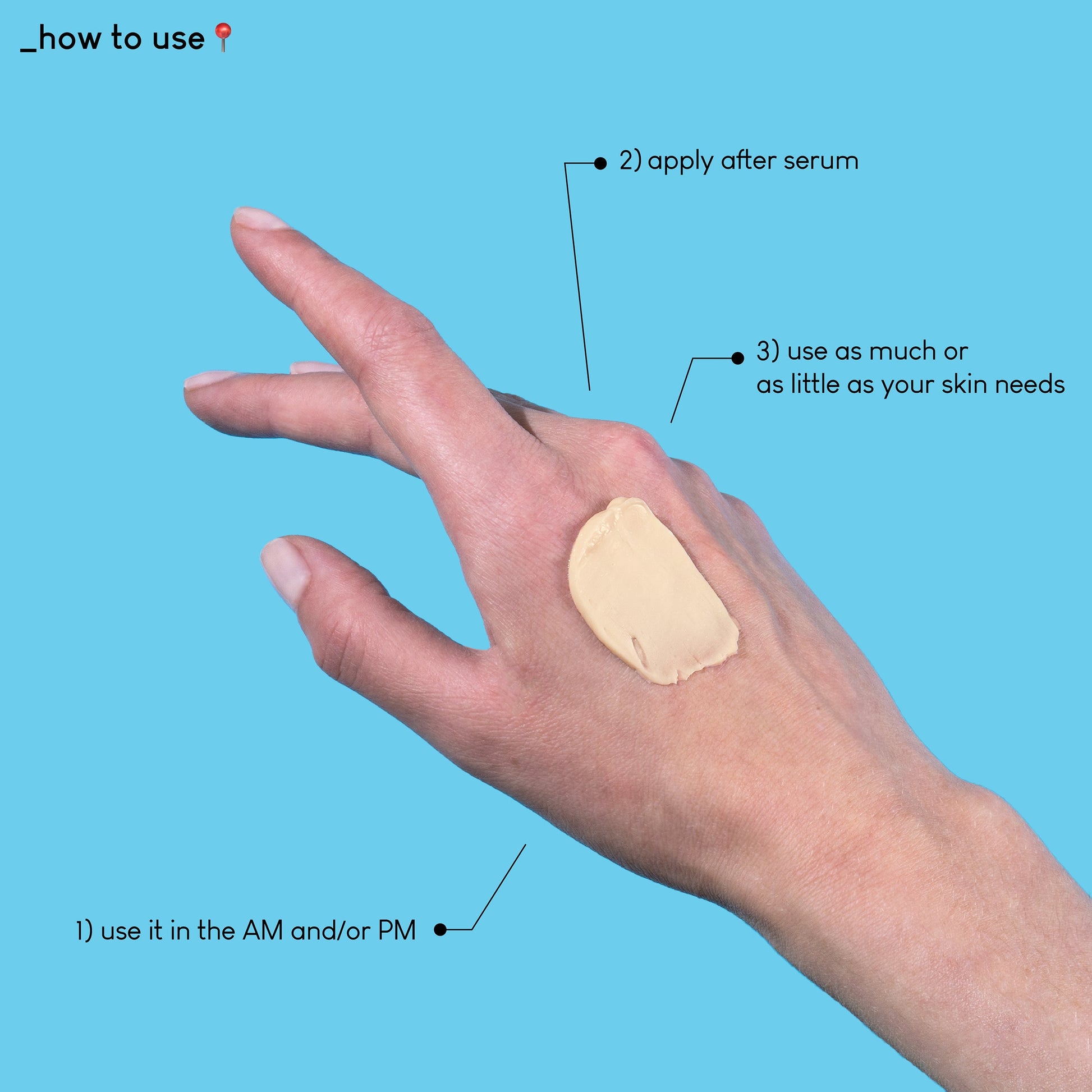 Apply after serums in the AM and/or PM. Use as much or as little as your skin needs.