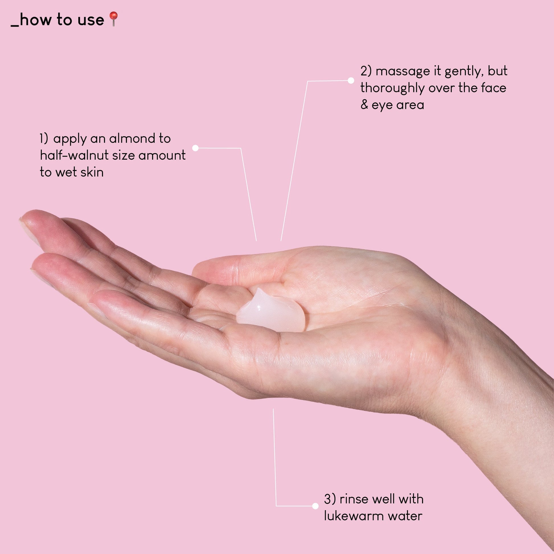 Wet face, squeeze cleanser into palm and gently, but thoroughly massage over face and eye area. Rinse well with tepid water and pat dry.